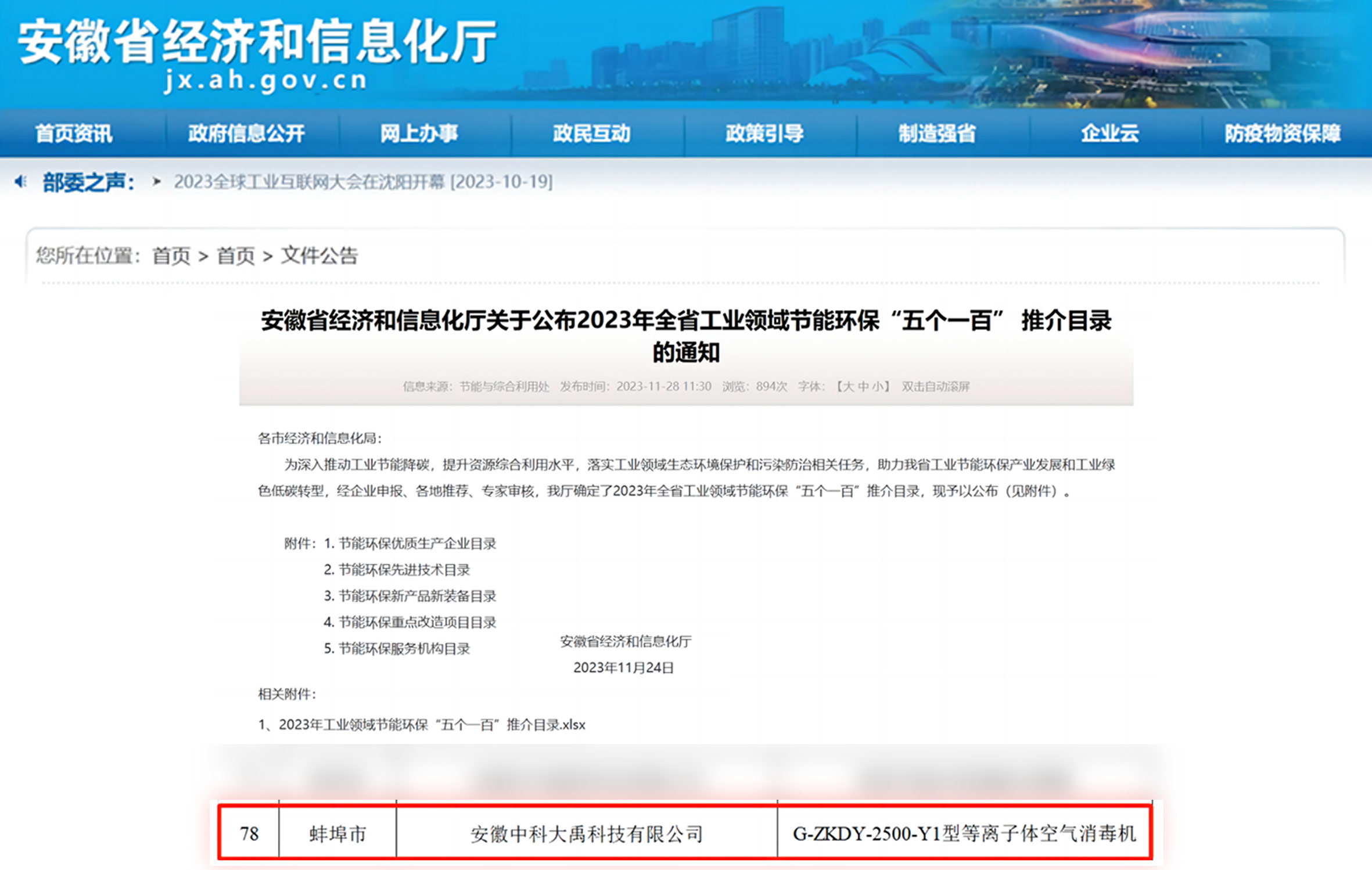 • 入選2023年全省工業(yè)領(lǐng)域節(jié)能環(huán)保“五個一百”推介目錄(節(jié)能環(huán)保新產(chǎn)品新裝備:G-ZKDY-2500-Y1型等離子體空氣消毒機)