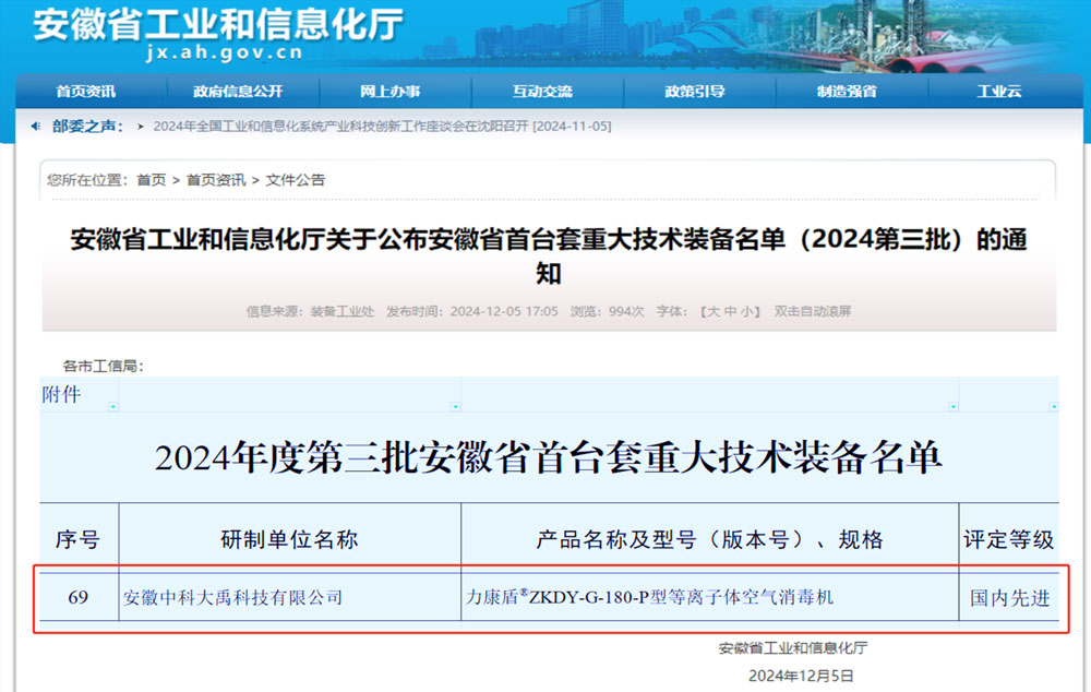 • 力康盾?ZKDY-G-180-P型等離子體空氣消毒機入選2024年度第三批安徽省首臺套重大技術(shù)裝備,評定等級:國內(nèi)先進